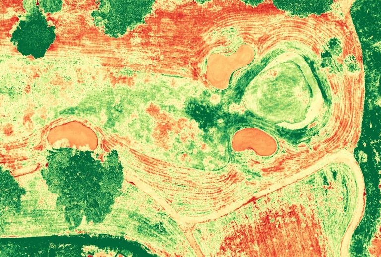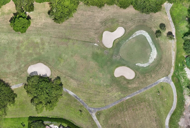 We provide an updated orthomosaic capture of your golf course, paired with a multispectral image to highlight plant health quality. The orthomosaic capture delivers a high-resolution, top-down view of your course, offering a clearer and more current visual than Google Earth, which can be outdated by years.